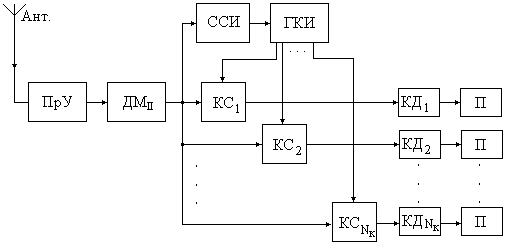 Сигналы с объекта через антенну поступают в приемное устройство дискретных сообщений (ПрУ), где производится предварительная фильтрация и усиление. Затем в ДМII для детектирования (снятие вторичной модуляции). На выходе ДМ выделяется оценка группового сигнала. Выделенный групповой сигнал подается на селектор синхроимпульсов (ССИ). ССИ может представлять собой, например, интегрирующую цепь (ИЦ) с пороговым устройством на выходе, срабатывающим при действии на входе ИЦ синхроимпульса (ИС). Выделенные ИС поступают на генератор канальных селекторных импульсов (ГКСИ), имеющий Nкан выходов. ГКСИ вырабатывает последовательности канальных импульсов, открывающих соответствующие временные канальные селекторы (КСi), представляющие собой схемы «И». Канальные сигналы поступают на канальные демодуляторы (КДМi), где снимается первичная модуляция. На выходе КД формируются оценки переданных сообщений (снимается первичная модуляция), поступающие к получателям (Пi) [2, 3].