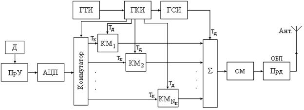 Ритм работы системы задается высокостабильным генератором тактовых импульсов (ГТИ). Тактовые импульсы поступают на генератор канальных импульсов (ГКИ), имеющий Nкан+1 выходов, где Nкан – число каналов. Канальные импульсы поступают соответственно на канальные модуляторы (КМi), где модулируются сообщениями, поступающими с коммутатора, а также на генератор синхронизирующих импульсов (ГСИ). На выходах КМ формируются модулированные канальные сигналы (первая ступень модуляции КвАМн). Параметры модуляции выбраны так, чтобы импульсы различных модулированных канальных сигналов (КС) не перекрывались. КС подаются на линейный сумматор (S) одновременно с последовательностью ИС, вырабатываемых ГСИ, которые необходимы для синхронизации работы приемной части. На выходе сумматора образуется групповой сигнал, состоящий из последовательности ИС и модулированных канальных импульсов. Групповой сигнал поступает на модулятор второй ступени (ОМ) и модулирует по амлитуде высокочастотную несущую (ОБП), вырабатываемую передатчиком (Прд).