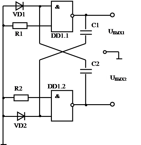 И-НЕ DD1.1, DD1.2, резисторы R1, R2 и конденсаторы C1, C2 времязавдающие цепи (ВЗЦ), защитные (демпфирущие) диоды VD1, VD2.