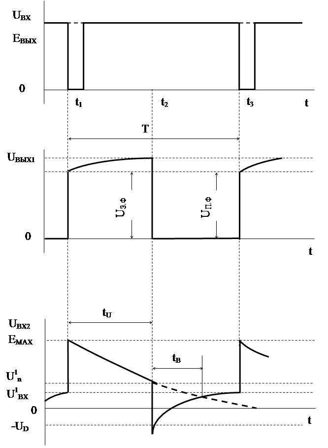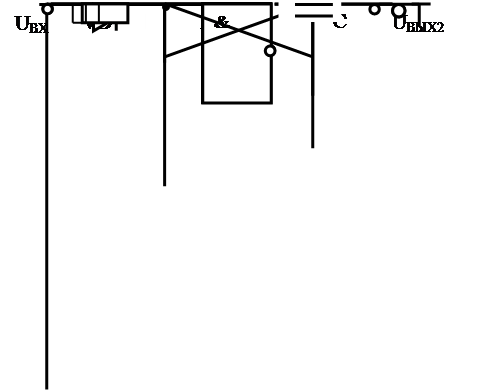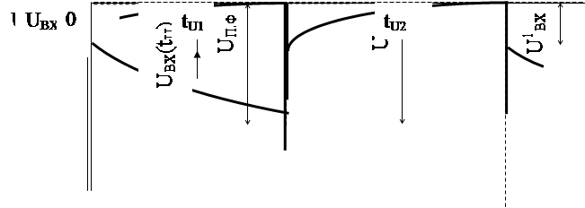 Напряжение UВХ2 на выходе ИЛЭ ТТЛ DD1.2 экспотенциально изменяется от Emax, стремясь к нулю . Формирование рабочего импульса длительностю tU заканчивается при UВХ2(tU) = U1n , так как дальнейшее уменшение входного напряжения приводит к увеличению выходного напряжения ИЛЭ ТТЛ DD1.2.