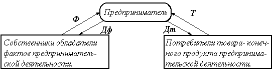Чтобы реализовать товар надо его иметь. Поэтому предприниматель приобретает, получает или сам производит товар, продвигает его для продажи потребителю, покупателю. Процесс получения предпринимателем продукта, необходимого потребителю, требует использования ряда факторов предпринимательской деятельности, т.е. средств производства и обращение товаров в виде рабочей силы, материальных, информационных, финансовых ресурсов, принимаемых в поизводстве, транспортировки, продаже товаров. Частично предприниматель может сам обладать такими факторами предпринимательской деятельности. Если же он их не имеет, то приобретает факторы (далее Ф ) у их обладателей, собственников, за денежную сумму (далее Дф ) и сиз поиощью производит, получает, достает и продает товар.