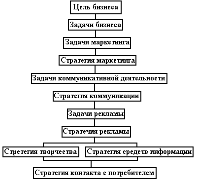 Планирование следует начинать с определения целей вашего бизнеса. Зная ее, вы можете установить задачи вашего бизнеса на планируемый перриод. Они определят задачи маркетинга и вашу стратегию маркетинга, которая, в свою очередь, самым тесным образом связана с выбором коммуникативных задач и стратегий коммуникации, основаных на банке данных. Следующим шагом будет, естественно, определние забач рекламной деятельности - что вы конкретно хотите достичь посредством рекламы ? Стратегия рекламы означает передачу определенных сообщений через выбранные вами средства информации. Следующий шаг - определе-ние стратегии творчества, то есть ответ на вопрос, как говорить с потребителем ? Одновременно обдумывается стратегия в отношении средств информации. И последнее - стратегия контакта с потребителем.