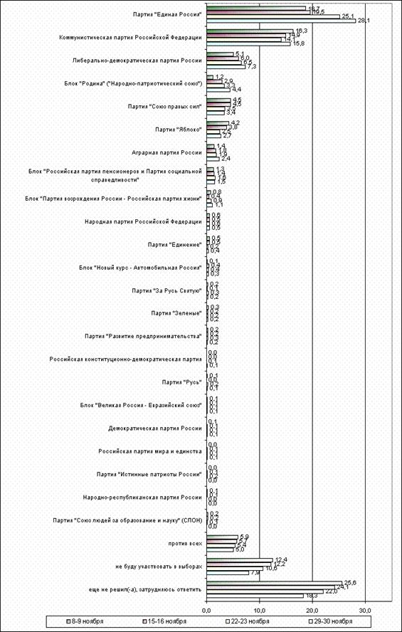 Лидирующее положение занимает партия "Единая Россия". Следующей по предпочтению избирателей стала партия КПРФ. Далее следует ЛДПР, "Яблоко", СПС. Оценка различных исследовательских организаций в данной ситуации носит некоторые различия (в долях процентов), но в целом совпадает.