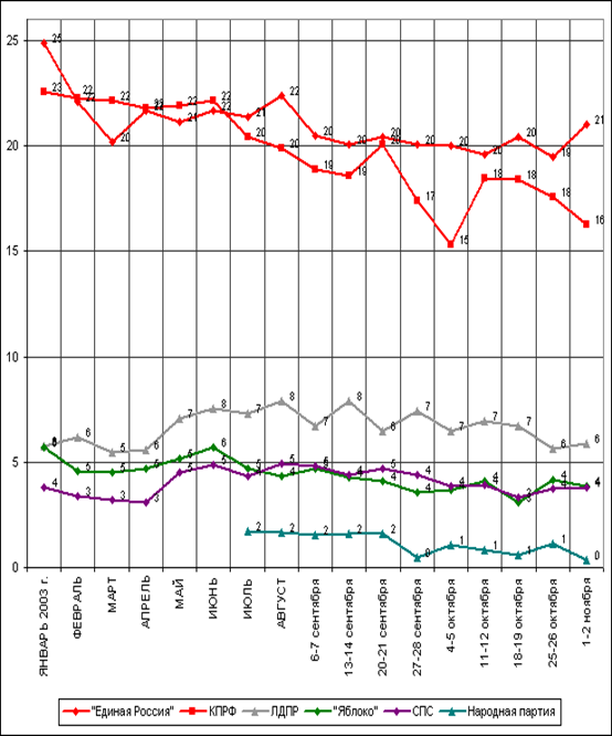 Средний процент приверженцев партии, согласно графику приведенному выше, равен 4,4 %(рис. 1).По данным опроса, проведенного Фондом "Общественное мнение" 30-31 августа 2003 г в 100 населенных пунктах 44 областей, краев и республик Россииготовы поддержать на выборах в Госдуму: