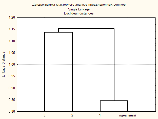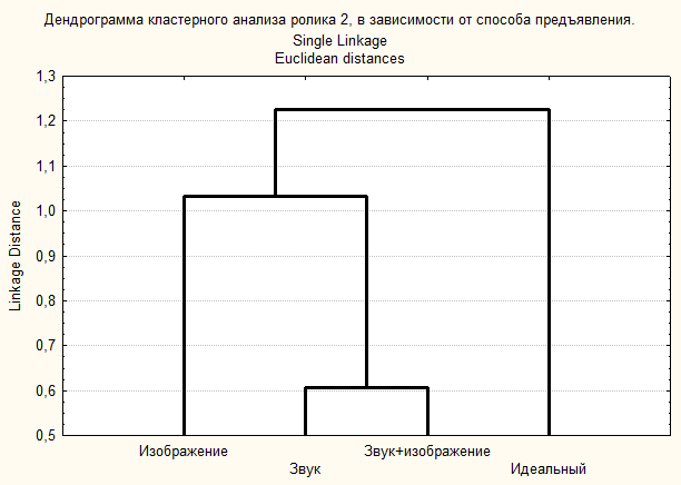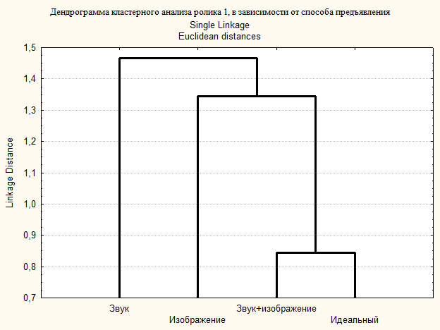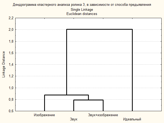 По результатам кластерного анализа было выявлено, что наиболее близкий к идеальному, - способ предъявления рекламного сообщения, при котором используются все три компонента рекламного сообщения. Такой способ предъявления ролика №1 составил один кластер с идеальным представлением потребителей о рекламе пива. Следующий по отдаленности от идеального, способ предъявления рекламного ролика, при котором используется только визуальный ряд. В отдельный кластер выделился способ предъявления рекламного ролика, при котором используется только аудиальный ряд.