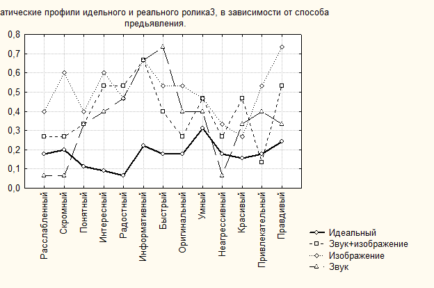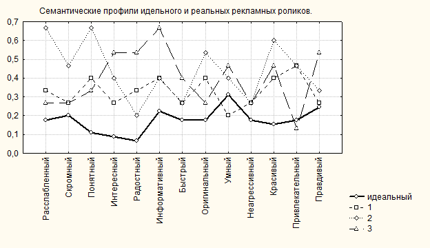 Рисунок №7 Семантические профили идеального и реальных рекламных роликов.