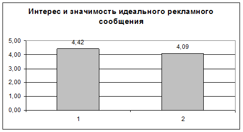 Следует также отметить, что по шкалам интерес и значимость (3,93 и 4,00 соответственно), при оценках идеального ролика (4,42 и 4,04) наибольшие оценки были получены для ролика №1, при использовании способа предъявления, включающем в себя все три компонента телевизионного рекламного сообщения. Это наибольшая величина по шкалам интерес и значимость, полученная в ходе всего исследования.