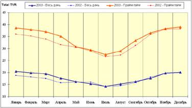 Телесмотрение также неравномерно распределено в течение года и имеет сезонный пик, приходящийся на декабрь-январь, и закономерный спад в летние месяцы. В среднем аудитория телевидения в течение сезона *** (с сентября по июнь) несколько выше. Так, в среднем за сезон 2002-2003 объем телевизионной аудитории составил 19% за весь эфирный день (7:00-26:00), и 37% в интервале прайм-тайма (19:00-23:00).