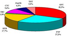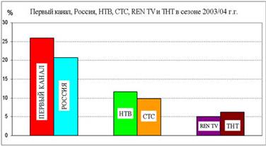 Первая лига. Далее с существенным отрывом расположились каналы первой лиги: ТНТ и RenTV , борющиеся за 5-6% от общей аудитории телевидения. Необходимо выделить телеканал ТНТ как самый динамично развивающийся и растущий канал в последнее время. В сезоне 2003-2004 ему удалось удвоить объем своей аудитории по сравнению с самым «провальным» для канала сезоном 2001-2002 г.
