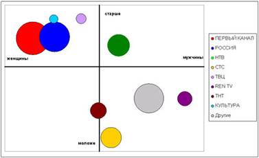Однако телеканалы различаются не только по объему, но и по составу своей аудитории. Наиболее очевидны поло-возрастные различия. Диагр. 3 отражает позиционирование телеканалов относительно общей аудитории телевидения и друг друга по таким характеристикам аудитории, как «пол» и «возраст» (а величина круга отражает объем аудитории телеканала (рейтинг).