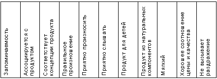 Следующим важным шагом является оценка важности каждой из выбранных характеристик исходя из концепции нового брэнда и важности каждого из элементов концепции, например: “мягкий шампунь для детей, созданный на основе только натуральных компонентов. Не вызывает раздражения и не щиплет глаза. Высокое качество по доступной цене”. Каждому из элементов концепции необходимо придать свои веса, с тем чтобы определить, какие из них являются более, а какие – менее важными. Имея подобную информацию, появляется возможность создания полного профиля продукта, на соответствие которому и проверяется название.