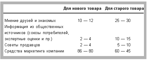 В конце девяностых годов потребитель уже обращается к другим источникам информации (Таблица 2). Значительную долю в поиске информации заняли такие каналы информации, как:
