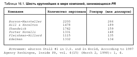 PR представляют собой растущую отрасль, в которой занято 150 тыс. человек и которая обслуживает клиентов разного масштаба и с различными интересами. Ежегодно ее доходы увеличиваются на 20–25%. Ежегодные гонорары, выплачиваемые клиентами PR -агентствам, составляют от нескольких сотен до нескольких миллионов долларов. В табл. 16.1 представлены шесть крупнейших компаний, работающих в области PR , и их годовой гонорар. 1 Кроме того, многие компании — такие, как Texas Instruments и IBM , — имеют собственные PR -отделы, управляющие большей частью или всей деятельностью компании в области PR .