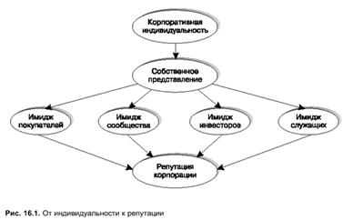 Зная общественное мнение и вопросы, связанные с бизнесом компании, специалисты PR могут лучше разработать программу создания и поддержания репутации. Политика организации и ее действия определяют ее репутацию — мнение, которого придерживается общественность о корпоративной индивидуальности и практике. Как иллюстрирует рис. 16.1, репутация — это итоговая сумма усилий компании по индивидуализации и имиджа заинтересованных лиц. Репутация зарабатывается, а не создается.13