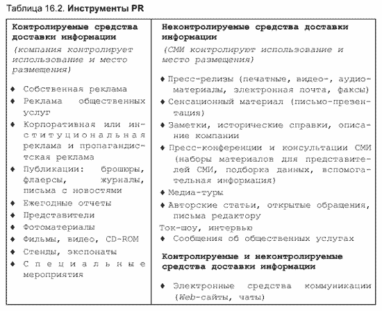 Арсенал инструментов, доступных специалистам PR, широк и разнообразен. Организация распространения материалов может быть разделена на две категории: контролируемые и неконтролируемые средства доставки информации. Контролируемые средства доставки информации включают собственную рекламу, объявления об общественных услугах, корпоративную (институциональную) рекламу, внутренние издания и презентации, которые оплачиваются спонсирующими организациями. В результате организация осуществляет полный контроль того, как и когда выходит сообщение. Неконтролируемые средства доставки информации, включают пресс-релизы, пресс-конференции и медиа-туры. Самыми современными являются электронные средства массовой информации и они могут быть как контролируемыми, так и неконтролируемыми. Все эти инструменты представлены в табл. 16.2.