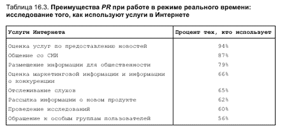 Фразер Сейтел говорит: “Нет сферы деятельности в области PR, более активно развивающейся в новом тысячелетии, чем Web-сайты, операции в Интернете и общее использование Интернета для коммуникаций с целевыми аудиториями”.21 В табл. 16.3 приводятся данные о том, как специалисты по PR используют услуги в режиме реального времени, основанные на исследовании, проведенном агентством Creamer Dickson Basford.22