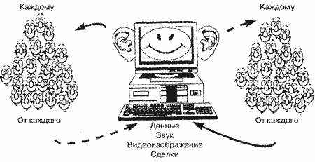 Давайте начнем с того, что представим себе некое идеальное интерактивное супер средство распространения информации (рис. 1). Оно полностью двустороннее в том смысле, что двусторонняя связь в каждой точке, где может произойти сделка. Это мультимедиа, т. е. система с комплексным предоставлением информации: данных, звука, видеоизображения.