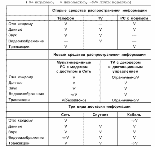 В табл. 3.1 сравниваются “старые” и “новые” средства распространения информации. Рассматриваются способы передачи данных, звука, видеоизображения и возможности проведения трансакций. У всех традиционных средств распространения информации отсутствует, по крайней мере, одна из функций; из старых средств телефон ближе всего подходит к тому, чтобы быть названным лучшим.