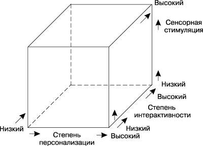 Изображенный на рис. 3 маркетинговый Медиа-куб; демонстрирует три измерения, которые определяют потенциал средств распространения информации в рамках маркетинговой функции: степень персонализации, степень интерактивности и сенсорную стимуляцию. Эти важные характеристики, зависящие от функции средств распространения информации в рекламном процессе, можно увидеть на маркетинговом Медиа-кубе ; ; Мы имеем дело с комбинацией трех измерений.