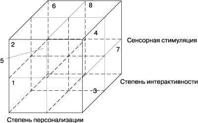Если мы выстроим 3 измерения, как показано на рис. 4, то сразу станет понятной роль, которую играет технология. Без сомнений, информационная технология имеет важное значение при любой коммуникации на индивидуальном уровне. В принципе, прибегая к купонной системе, можно реализовать эту функцию и без компьютера. Но как только появляется составляющая, которая требует наличия интерактивности, так сразу автоматизация становится очень важной. Стимуляция чувств также ограничена без информационной технологии. Все проанализировав, мы поймем, что только средства передачи данных, расположенные впереди левого квадранта куба, могут обходиться без ИТ-компонента.