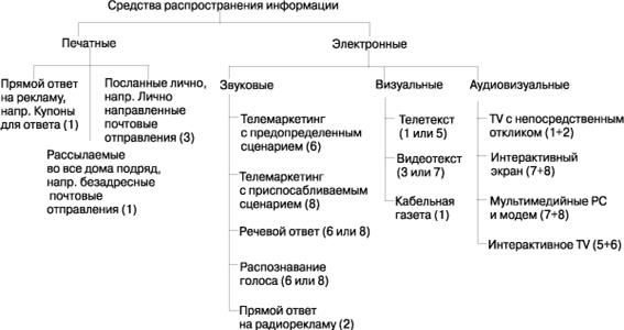 В различных сферах деятельности по-разному трактуется понятие средства распространения информации. Для нас электронные и печатные средства распространения информации — это носители информации в современном мире маркетинга: газеты, книги, журналы, брошюры, радио, телевидение и персональные компьютеры. Данное определение также распространяется на телефон, если по нему дается интерактивный речевой ответ.