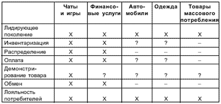 В помощь этому процессу в табл. 3.2 перечислен ряд коммерческих функций для различных товаров и услуг. Знак Х указывает на то, что функция для определенных товаров и услуг будет выполнена посредством средств распространения информации. Минус (-) предполагает, что это не тот случай, а вопрос (?) означает, что не совсем понятно, можно ли решить задачу с помощью средств распространения информации или следует решать ее каким-то другим образом.