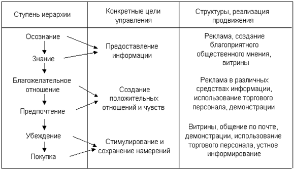 Цели продвижения: стимулирование спроса и улучшение образа компании. Конкретные действия зависят от так называемой иерархии воздействия (табл. 9.1).