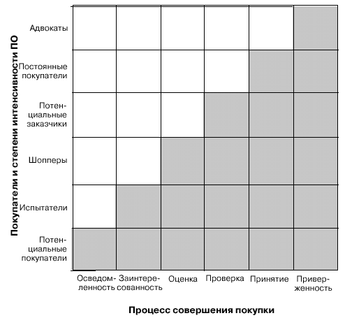 Так, повышение уровня осведомленности в отношении компании или ее товаров/услуг может быть важным пунктом для перехода покупателей из состояния потенциальных в состояние шопперов, но может не сыграть ни малейшей роли в передвижении со ступени потенциального заказчика на ступень адвоката. На рис. 1 описана взаимозависимость между интенсивностью ПО покупателей с компанией и процессов совершения покупки, через которые они проходят, увеличивая свою предпринимательскую и умственную долю в компании.