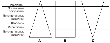 Рассмотрите ситуацию, когда у компании достаточно много потенциальных покупателей с возможной высокой ценностью от этой группы, но все меньше покупателей и меньше ценность их жизненного цикла с каждой ступенькой вверх по континууму. С другого конца спектра рассмотрите компанию с большим количеством покупателей, интенсивно связанных с нею, и высоким уровнем ценности времени жизни, но с очень немногим количеством потенциальных покупателей. На рис. 2 эти случаи представлены как А и С соответственно, а В — это компания с одинаковым количеством покупателей и ценностью на каждом уровне.