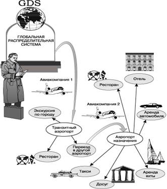 Не просто понять, какой товар предлагает авиакомпания, скажем Аэрофлот, особенно если учесть, что сама перевозка пассажиров во всем мире является убыточной. Air France, Delta Airline, Lufthansa, British Airways и другие ведущие авиаперевозчики давно уже являются структурными частями крупных холдингов, предоставляющих комплексные туристические, транспортные, гостиничные и прочие услуги. Именно они и продаются в качестве консолидированного товара через созданные ими же GDS (Глобальные распределительные системы), а авиабилет является лишь одной из его составляющих (рис. 1).