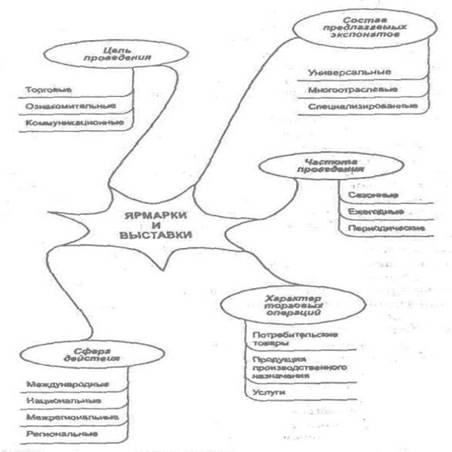 Как внутри государства, так и за рубежом могут проводиться и международные ярмарки и выставки. Организация таких мероприятий предполагает участие в их работе фирм из различных стран, причем обычно считается, что данная ярмарка или выставка является международной, если среди ее экспонатов, по крайней мере, 10-15 % принадлежит фирмам зарубежных стран. Наконец, можно классифицировать ярмарки и выставки с учетом целей их проведения. Такой подход позволяет ярмарки и выставки подразделять на: