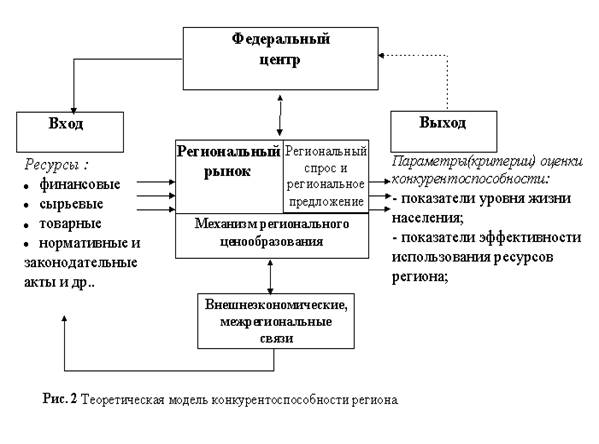 Нами предлагается такое определение конкурентоспособности региона, которое включает два основополагающих момента: необходимость достижения высокого уровня жизни населения и эффективность функционирования хозяйственного механизма региона. В настоящее время, в основе хозяйственного механизма региона- региональный рынок при определённой законодательством регулирующей роли федеральных и местных органов власти.
