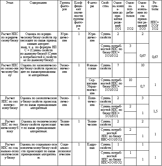 Необходимо отметить, что анализ конкурентоспособности при помощи показателя конкурентоспособности на основе НПС, предполагает получение качественного результата, дающего возможность адекватно оценить реальную конкурентоспособность на данном рынке в данное время и найти кризисные точки и группы факторов, что будет рассмотрено в ниже приведенном примере.
