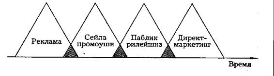 Комплекс маркетинговых коммуникаций развивает и интегрирует действия промышленной или сервисной фирмы, направленные на реализацию поставленных ею сбытовых целей. Смысл указанной, развивающейся во времени интеграции и ее элементов разъясняет схема, представленная на рис. 1.Отдельные дисциплины этого комплекса - рекламная деятельность различных видов - на схеме намеренно представлены в виде треугольников, как вершины айсбергов, символизируя достаточную сложность специфики их взаимоотношений.