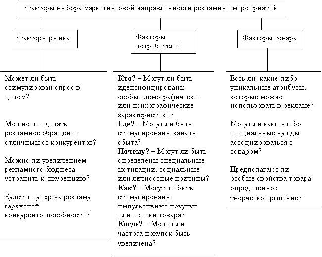 Установить оптимальную направленность рекламных действий, реализуемых в рекламной кампании с учетом маркетинговых факторов, помогут ответы на вопросы, включенные в следующую схему (рис. 7):