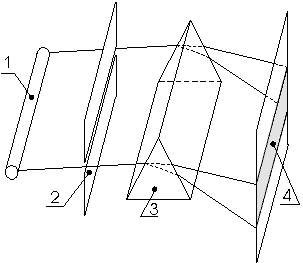 Рис. 2. 1 - источник белого света, 2 - диафрагма, 3 - призма, 4 - изображение из оптически прозрачного материала. |