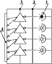 Рис. 4 (разрез) 1 - источники белого света, 2 - диафрагма, 3 - система призм, 4 - изображение. |