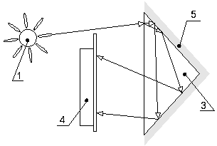 Рис. 5 1 - источник света, 3 - призма, 4 - рекламное изображение, 5 - светоотражающая (зеркальная) поверхность. |
