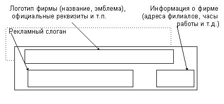 Логотип фирмы (название, эмблема), Информация о фирме официальные реквизиты и т.п. (адреса филиалов, часы работы и т.д.)