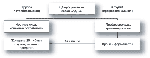 Ко второй группе (профессиональной) относятся врачи и фармацевты, рекомендациями которых руководствуется значительная часть потребителей БАД. Участие этой целевой группы в продвижении данных продуктов и их положительное отношение к ним очень важно, так как создает большее доверие к марке со стороны потребителей. Из характеристик этой группы наиболее важен их профессиональный статус (демографически это чаще женщины в возрасте 25-50 лет со средним доходом). На схеме 2 графически показаны обе целевые группы. В дальнейшем выбор каналов коммуникации для продвижения марки "Э" будет осуществляться с учетом обеих групп.