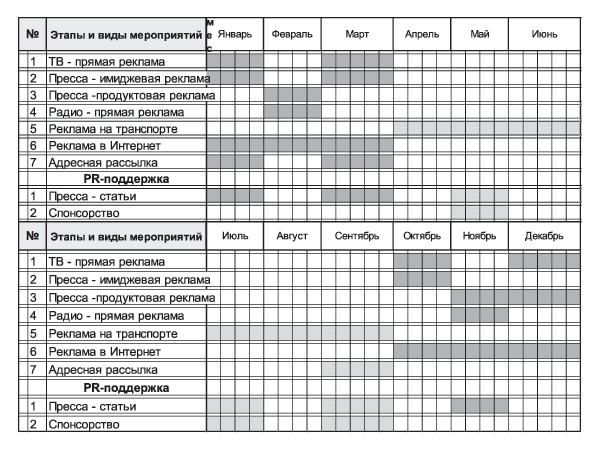 На схеме 4 показан годовой общий план кампании по каналам коммуникации. Более темные места на схеме соответствуют более интенсивной кампании (январь-март, октябрь-декабрь). Интенсивная кампания идет в период сезонного всплеска потребления, что позволит нам привлечь дополнительное внимание к нашей марке, создать определенный уровень знания и сформировать спрос. В летний сезон интерес к БАД падает. Для поддержки знания марки (чтобы меньше усилий и средств затрачивать на подъем знания осенью) в этот период нужно воспользоваться транспортной рекламой в приоритетных регионах, спонсорскими и PR-мероприятиями. Осенью, незадолго до начала сезонного подъема продаж БАД, интенсивность кампании постепенно возрастает.