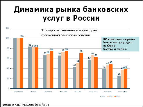 По данным исследований, в 2006 году наблюдался значительный рост розничных банковских услуг – доля пользователей банковскими услугами возросла до 71% населения (не включая услуги оплаты коммунальных платежей). По этому показателю мы достаточно быстрыми темпами догоняем и перегоняем восточно-европейские страны. Этот рост, в первую очередь, обусловлен распространением пластиковых карт как средств выплаты зарплат. Помимо этого, мы отмечаем бум кредитования – за последний год доля пользователей кредитов удвоилась, достигнув 20%, и мы практически подошли к показателю Германии. Такой рост обусловленсен развитием потребительского кредитования. Пользование ипотекой находится пока не на самом высоком уровне, но мы наблюдаем уверенную тенденцию к росту: так, за последний год число пользователей ипотекой удвоилось, а увеличение интересных предложений может дальше стимулировать спрос на этом рынке.