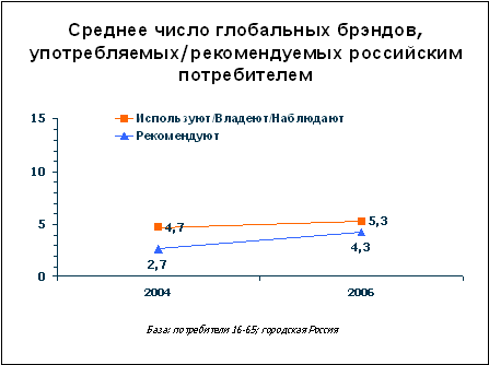 На основе данных исследования Ропер Репорт можно отметить, что следствием тех усилий, которые крупнейшие мировые компании прилагают для продвижения своих брэндов, является непрерывный рост числа пользователей глобальных брэндов и поклонников глобальных брэндов, которые рекомендуют брэнд. В 2006 году средне статистический россиянин использовал 5 и более глобальных брэндов и рекомендовал 4.
