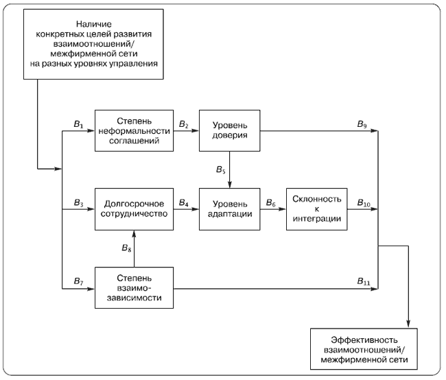 Как показало исследование, многие фирмы стремятся повысить эффективность взаимодействия с теми партнерами, к которым они испытывают наибольшее доверие; можно предположить, что в подобном случае фирма будет в большей степени удовлетворена показателями своей деятельности. Таким образом, чем выше уровень доверия между фирмами, тем большей эффективностью отличаются взаимоотношения/межфирменная сеть (В9). Также представляется вероятным, что и высокая склонность к интеграции позитивно влияет на эффективность взаимоотношений/межфирменной сети (В10). Кроме того, высокая степень взаимозависимости фирм, в свою очередь, повышает эффективность взаимоотношений/межфирменной сети (В11).