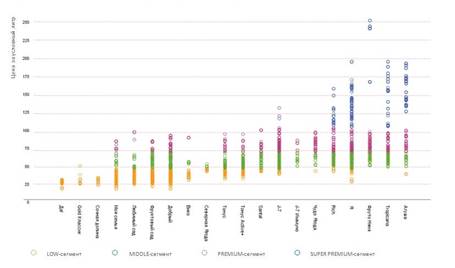 Несмотря на низкую активность игроков в нижнем low-сегменте, именно он является наиболее насыщенным внутри обобщенного mass-сегмента, тогда как представители middle и premium распределены относительно равномерно по ценовому показателю. Так как марки-лидеры рынка представлены на границе «идеализированных» low, middle и premium-сегментов, отдельное их изучение не представляется целесообразным.