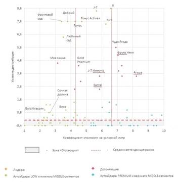 Одной из выявленных особенностей рынка соков стал крайне высокий разброс цен на продукцию (более 1500 руб. за усл. литр), что обусловило структуру сегментации, в которой нашлось место только трем сегментам — mass, super premium и extra premium-сегментами. В свою очередь к mass-сегменту относится более 80% всей представленной продукции в исследуемой категории, которую логично разбить на три ценовые ниши (low, middle и premium-сегменты). Очень важно, что даже среди основных игроков рынка практически нет брендов, ориентированных на конкретную целевую группу по ценовому признаку.