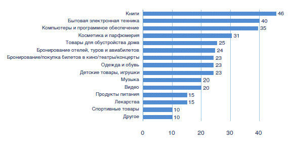 К другим категориям товаров, которые респонденты чаще всего покупали в Сети, также относятся: бытовая электронная техника — 40%, компьютеры и программное обеспечение — 35%, косметика и парфюмерия — 31%.