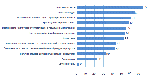 Российские потребители оценили удобство и выгоду совершения покупок онлайн: это и круглосуточная доступность, и возможность избежать суеты традиционных магазинов, а также широкий ассортимент товаров, возможность ознакомиться с техническими характеристиками и воспользоваться системой сопоставления цен. В городах, за исключением Москвы и Санкт-Петербурга, большинство респондентов (50-70%) назвали одним из основных преимуществ интернет-торговли возможность купить товар, не представленный в их регионе. В общих результатах опроса три четверти интернет-пользователей признали главным преимуществом экономию времени, а 65% — доставку на дом.