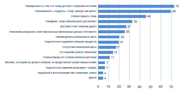 По результатам исследования, основным сдерживающим фактором для российских пользователей является необходимость «увидеть и пощупать товар» перед его приобретением. Почти 60% респондентов не совершают покупки в интернет-магазинах именно по этой причине. Отсутствие внимания к таким проблемам, как завоевание доверия потребителей и усовершенствование логистики, грозят интернет-магазинам безвозвратной потерей покупателей и потенциальных клиентов. Более половины опрошенных указали, что неуверенность в хорошем состоянии товара при доставке, а также проблемы с возвратом являются основными причинами, отталкивающими их от покупок в сети. Беспокойство, связанное с тем, что заказанный товар придется ждать слишком долго, испытывают 36% опрошенных, причем в регионах этот показатель выше среднего на 8–17%. Доля респондентов, считающих стоимость доставки завышенной, составила более 30%.