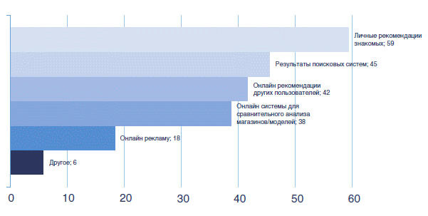 По результатам исследования, для российских потребителей, помимо личных рекомендаций знакомых, Интернет становится основным информационным ресурсом и местом принятия решения о покупке. При выборе интернет-магазина 59% опрошенных учитывают личные рекомендации знакомых, а 42% респондентов — онлайн-отзывы других пользователей. 45% участников опроса принимают во внимание результаты поисковых систем, а респонденты в возрасте от 36 до 55 лет доверяют этим результатам даже больше, чем рекомендациям знакомых. Также среди этой возрастной аудитории большей популярностью пользуются системы сравнительного анализа — на 7% выше среднего результата.